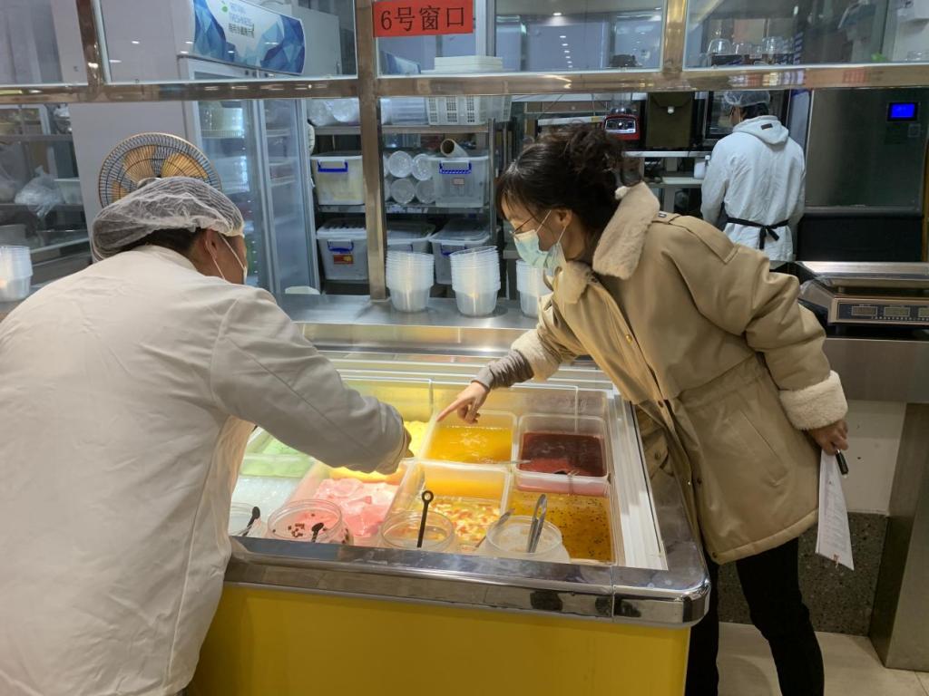 活动中,后勤处组织了10余人的评分小组,分成两组对学校两个食堂的窗口进行检查打分,大家根据评分规则,认真检查各窗口员工健康状况、食品制作操作规范情况、后厨卫生状况、仓库食材存放情况以及食品新鲜度情况等,并根据检查结果进行打分排序。
